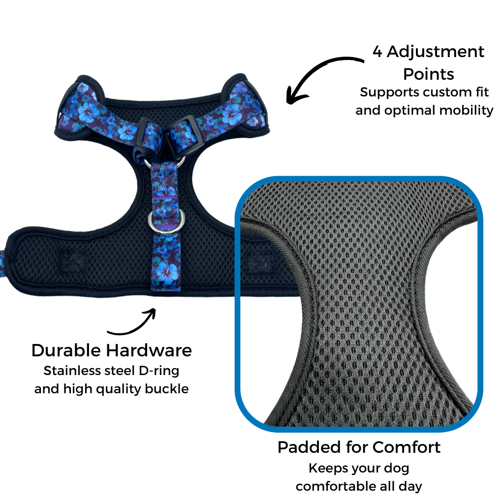 Inspired by the vibrant spirit of Hawaii, Aloha Dog Harnesses are made for adventure-loving pups who crave comfort, freedom, and a little tropical flair. Whether you're exploring a rugged hiking trail, strolling the beach at sunset, or just enjoying a backyard chase, this harness is built to move with your dog.
