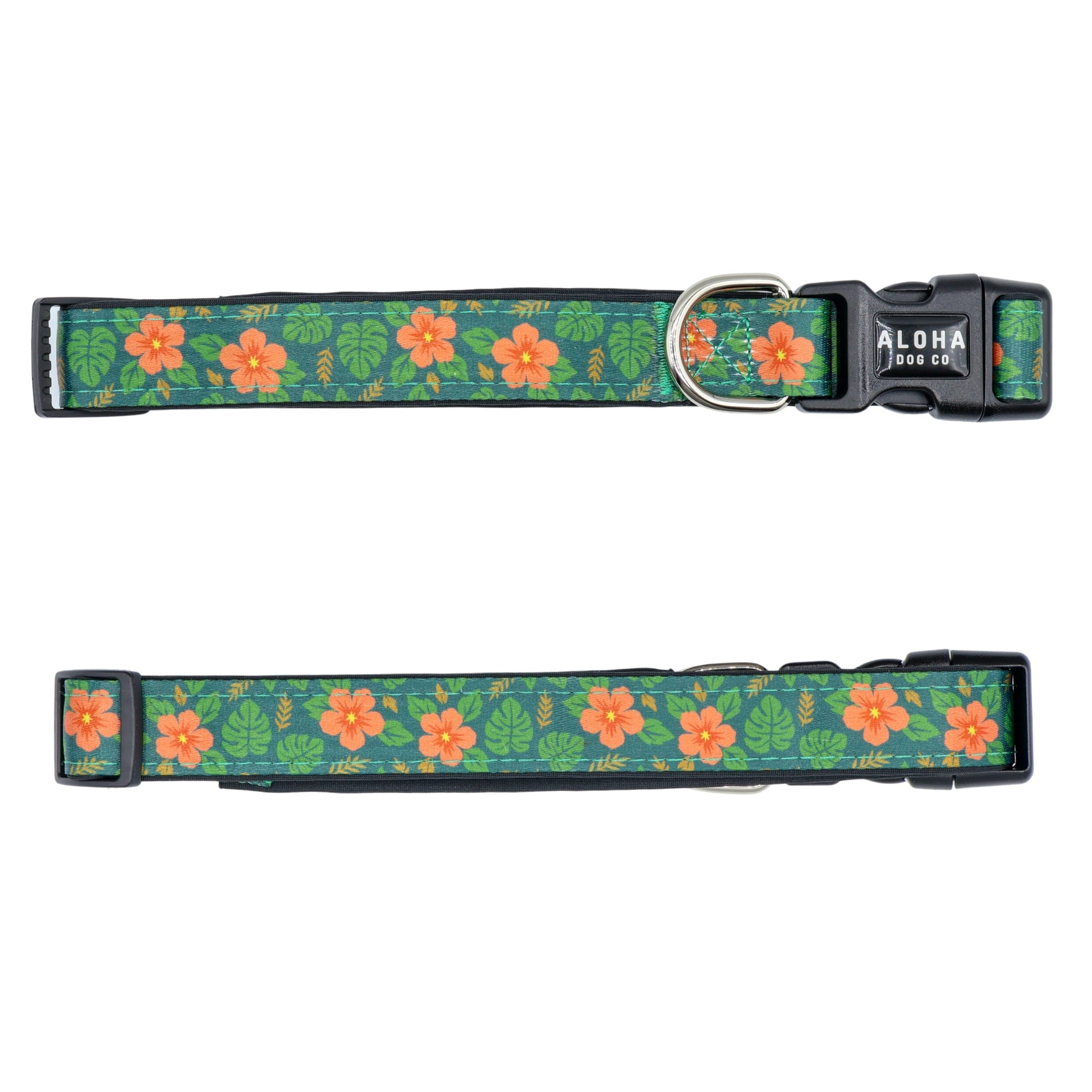 This lush tropical design features rich green foliage and vibrant orange hibiscus blooms that bring rainforest vibes to every adventure. It's like wrapping your dog in a tropical garden, perfect for nature lovers who want their pup to stand out on every trail, beach, or neighborhood walk.